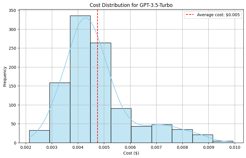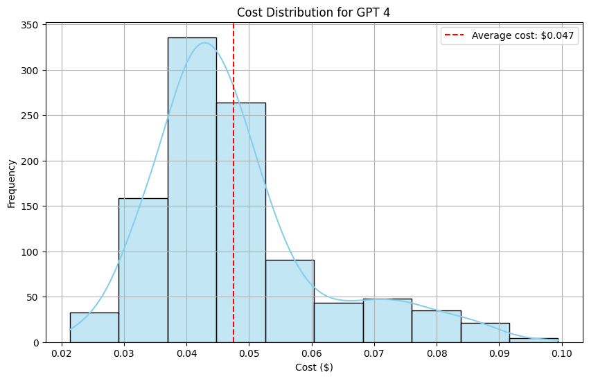 To estimate the expenses associated with evaluating our solution using Open AI models, we generated two histograms to compare the pricing between GPT-4 and GPT-3.5 Turbo.