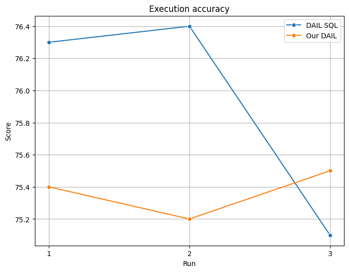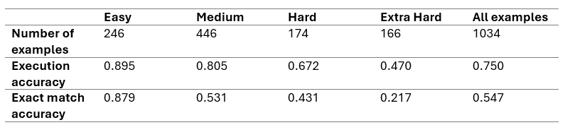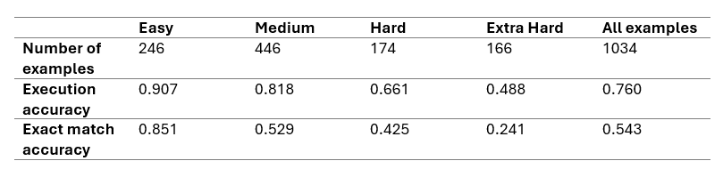 Below are the results from our evaluation on Execution accuracy, which assesses the correctness of generated SQL queries when executed on the dataset: