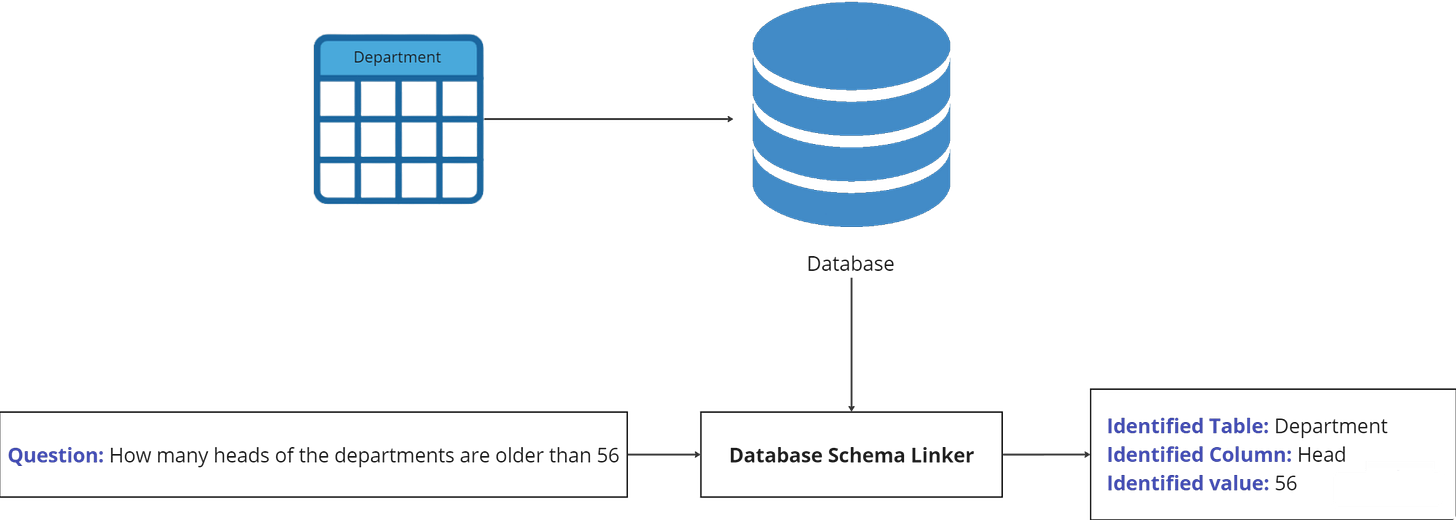 Using the database schema and the user's question, the Database Schema Linker (DSL) identifies specific tokens in the question that should be masked. These tokens typically represent entities within the database, such as column or table names, or values present in the database.