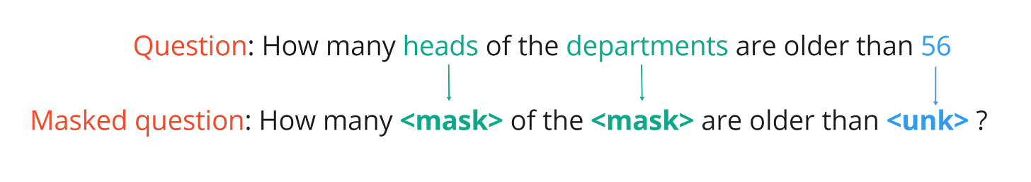 DSL serves as a pivotal component in our implementation, facilitating the process of question masking. Its primary function is to identify specific tokens within the user's question that require masking. such tokens stand for elements found within the database, like names of columns or tables, or the data values stored in the database.