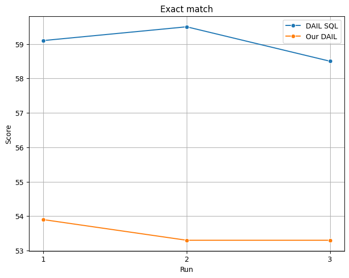 And our evaluation on Exact match, which examines how closely the generated SQL query matches the ground truth query in structure: