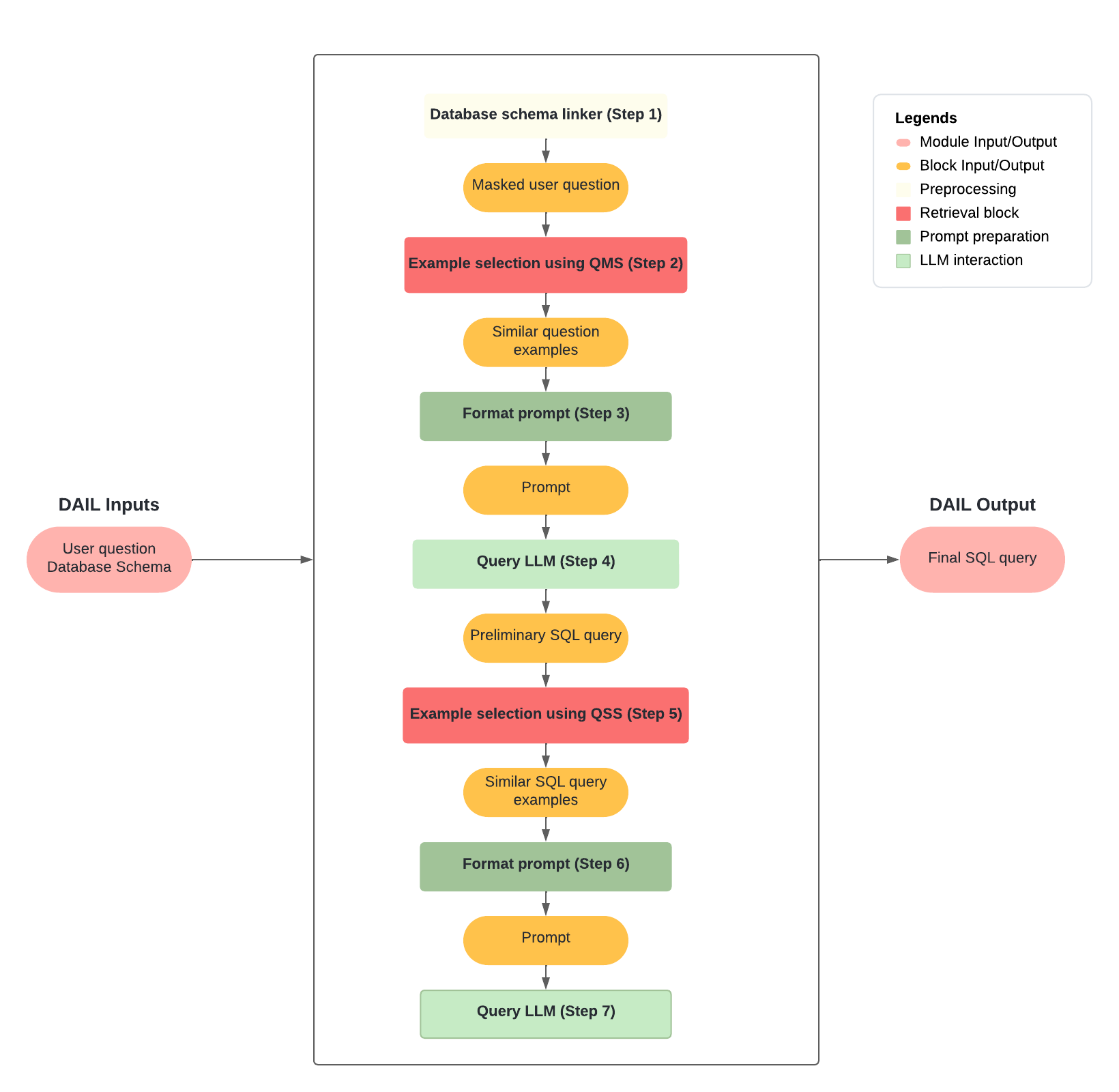 Using the merged examples from QMS and QSS, a final DAIL-SQL prompt containing all examples, is then passed to the selected LLM to generate the final SQL query.