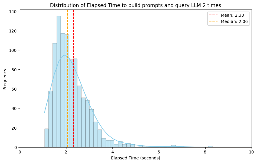 The distribution of elapsed time required to construct prompts and query the Large Language Model (LLM) twice shows that the majority of examples typically fall within the range of 1.5 to 4 seconds. This suggests that the processing of most instances occurs within a reasonable amount of time.